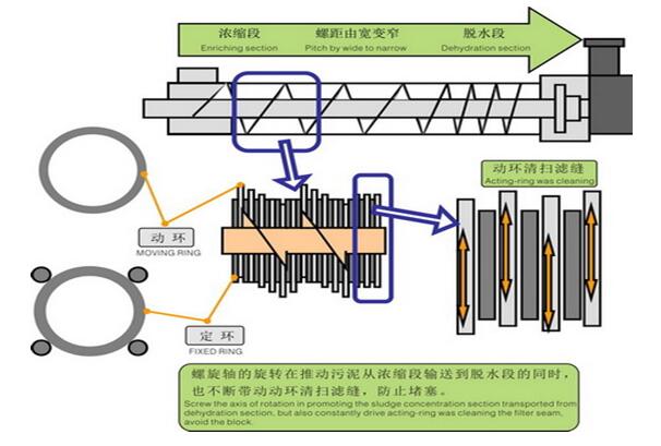 1、浓缩:螺旋推动轴转动时,设在推动轴外围的多重固活叠片相对移动,在重力作用下水从相对移动的叠片间隙中滤出,实现快速浓缩。