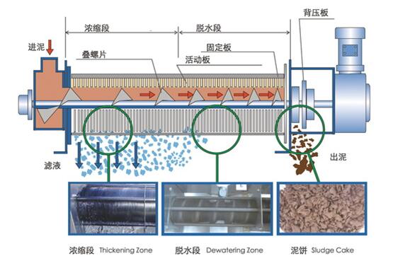 2、脱水:经过浓缩的污泥随着螺旋轴的转动不断往前移动;沿泥饼出口方向,螺旋轴的螺距逐渐变小,环与环之间的间隙也逐渐变小,螺旋腔的体积不断收缩;在出口处背压板的作用下,内压逐渐增强,在螺旋推动轴依次连续运转推动下,污泥中的水分受挤压排出,滤饼含固量不断升高,最终实现污泥的连续脱水。