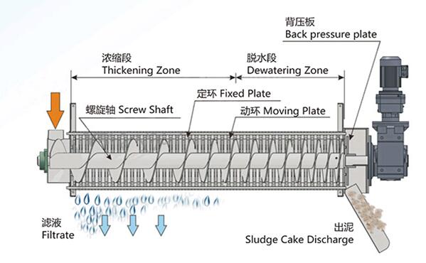 2、脱水:经过浓缩的污泥随着螺旋轴的转动不断往前移动;沿泥饼出口方向,螺旋轴的螺距逐渐变小,环与环之间的间隙也逐渐变小,螺旋腔的体积不断收缩;在出口处背压板的作用下,内压逐渐增强,在螺旋推动轴依次连续运转推动下,污泥中的水分受挤压排出,滤饼含固量不断升高,最终实现污泥的连续脱水。