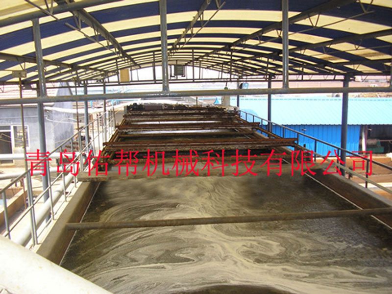 涡凹、溶气组合式气浮机为一体化撬装设备,涡凹气浮系统和溶气气浮系统共用一个箱体,共用一台刮渣机,设备体积减小,运输、安装比较方便。进水经加药混合后,在涡凹曝气机的搅拌和曝气的作用下,药剂和污水更成分的混合反应并与气泡粘附,大部分悬浮物漂浮于池体表面,经出水堰调节水位后,浮渣不需经过刮渣机可自流进排渣槽排出,浮渣含水量低,浓缩效果好。经过涡凹曝气机处理后的污水自流进溶气气浮系统,涡凹曝气机所不能处理彻底的细小的絮体和污泥等悬浮物,经微小的气泡捕捉上浮形成密度比较小的浮渣,再有刮渣机推送到排渣槽排出。处理后的水经过出水堰溢流出设备外。