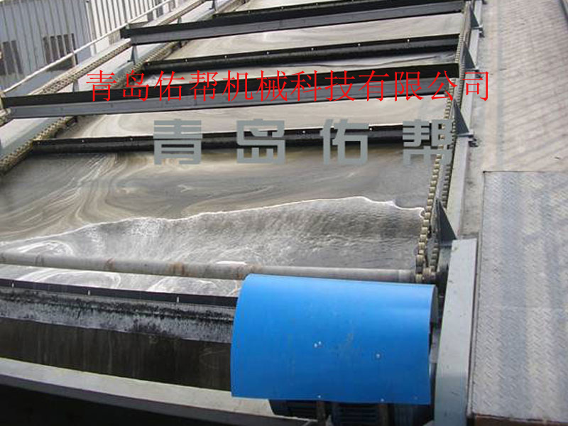 链板式刮油刮泥机设有两条平行封闭的牵引链条,上面装有多块刮板,在驱动装置的带动牵引下,刮板沿沉淀池上下所设导轮和导轨循环运动,利用刮板的循环缓慢移动,将液面漂浮的油渣从入水端刮集到出水端的集油管中排出池外,同时将沉降于池底的泥沙从出水端刮集到入水端的集泥槽中经排泥阀排出,从而初次完成机械净化污水的目的。